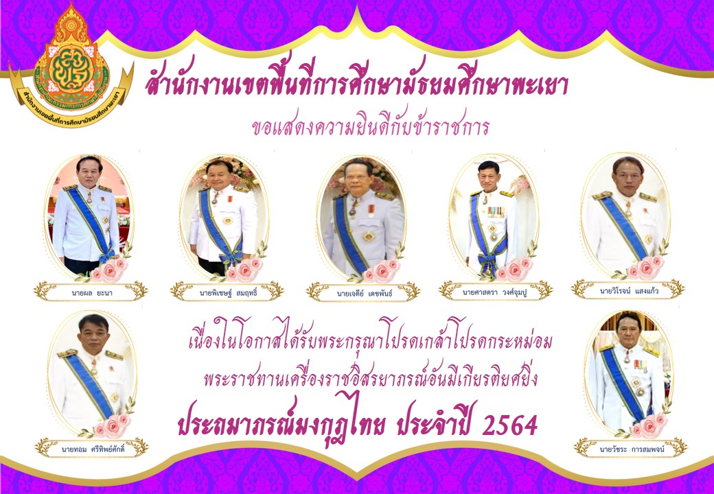 สำนักงานเขตพื้นที่การศึกษามัธยมศึกษาพะเยา ขอแสดงความยินดีกับข้าราชการในสังกัด เนื่องในโอกาสได้รับพระกรุณาโปรดเกล้าโปรดกระหม่อมพระราชทานเครื่องราชอิสรยาภรณ์อันมีเกียรติยศยิ่งประถมาภรณ์มงกุฎไทย ประจำปี 2564 จำนวน 7 ราย ได้แก่