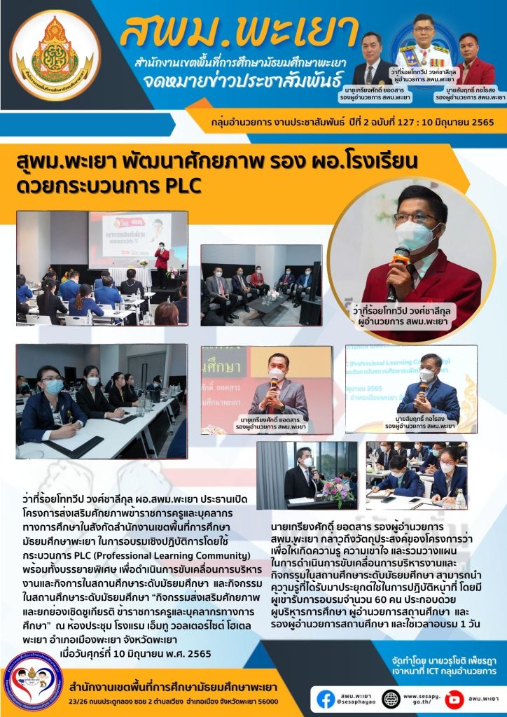 ว่าที่ร้อยโททวีป วงศ์ชาลีกุล ผอ.สพม.พะเยา ประธานเปิด โครงการส่งเสริมศักยภาพข้าราชการครูและบุคลากรทางการศึกษาในสังกัดสำนักงานเขตพื้นที่การศึกษามัธยมศึกษาพะเยา ในการอบรมเชิงปฏิบัติการโดยใช้กระบวนการ PLC (Professional Learning Community) พร้อมทั้งบรรยายพิเศษ เพื่อดำเนินการขับเคลื่อนการบริหารงานและกิจการในสถานศึกษาระดับมัธยมศึกษา และกิจกรรมในสถานศึกษาระดับมัธยมศึกษา “กิจกรรมส่งเสริมศักยภาพ และยกย่องเชิดชูเกียรติ ข้าราชการครูและบุคลากรทางการศึกษา” ณ ห้องประชุม โรงแรม เอ็มทู วอลเตอร์ไซต์ โฮเตล พะเยา อำเภอเมืองพะเยา จังหวัดพะเยา เมื่อวันศุกร์ที่ 10 มิถุนายน พ.ศ. 2565