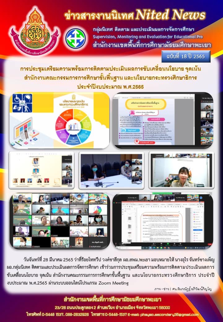 ข่าวสารงานนิเทศ ฉบับที่ 18 ปี 2565 การประชุมเตรียมความพร้อมการติดตามประเมินผลการขับเคลื่อนนโยบายจุดเน้นสำนักงานคณะกรรมการการศึกษาขั้นพื้นฐานและนโยบายกระทรวงศึกษาธิการประจำปีงบประมาณ พ.ศ.2565 ประชาสัมพันธ์ สพม.พะเยา