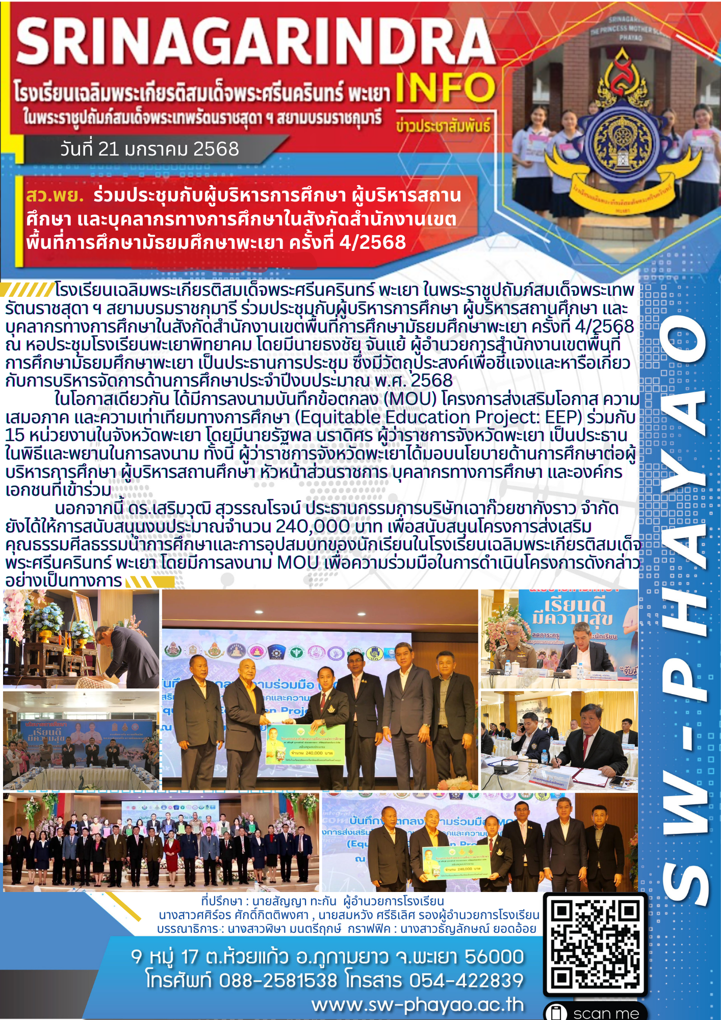 จดหมายข่าวโรงเรียน สว.พย. ร่วมประชุมกับผู้บริหารการศึกษา ผู้บริหารสถานศึกษา และบุคลากรทางการศึกษาในสังกัดสำนักงานเขตพื้นที่การศึกษามัธยมศึกษาพะเยา ครั้งที่ 4/2568 23 มกราคม 202523 มกราคม 2025