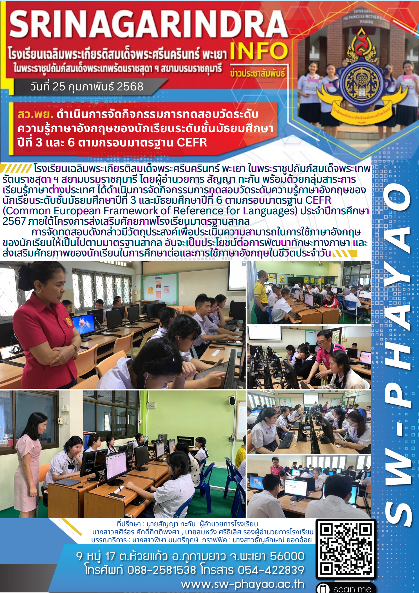 จดหมายข่าวโรงเรียน สว.พย. ดำเนินการจัดกิจกรรมการทดสอบวัดระดับความรู้ภาษาอังกฤษของนักเรียนระดับชั้นมัธยมศึกษาปีที่ 3 และ 6 ตามกรอบมาตรฐาน CEFR 25 กุมภาพันธ์ 202525 กุมภาพันธ์ 2025