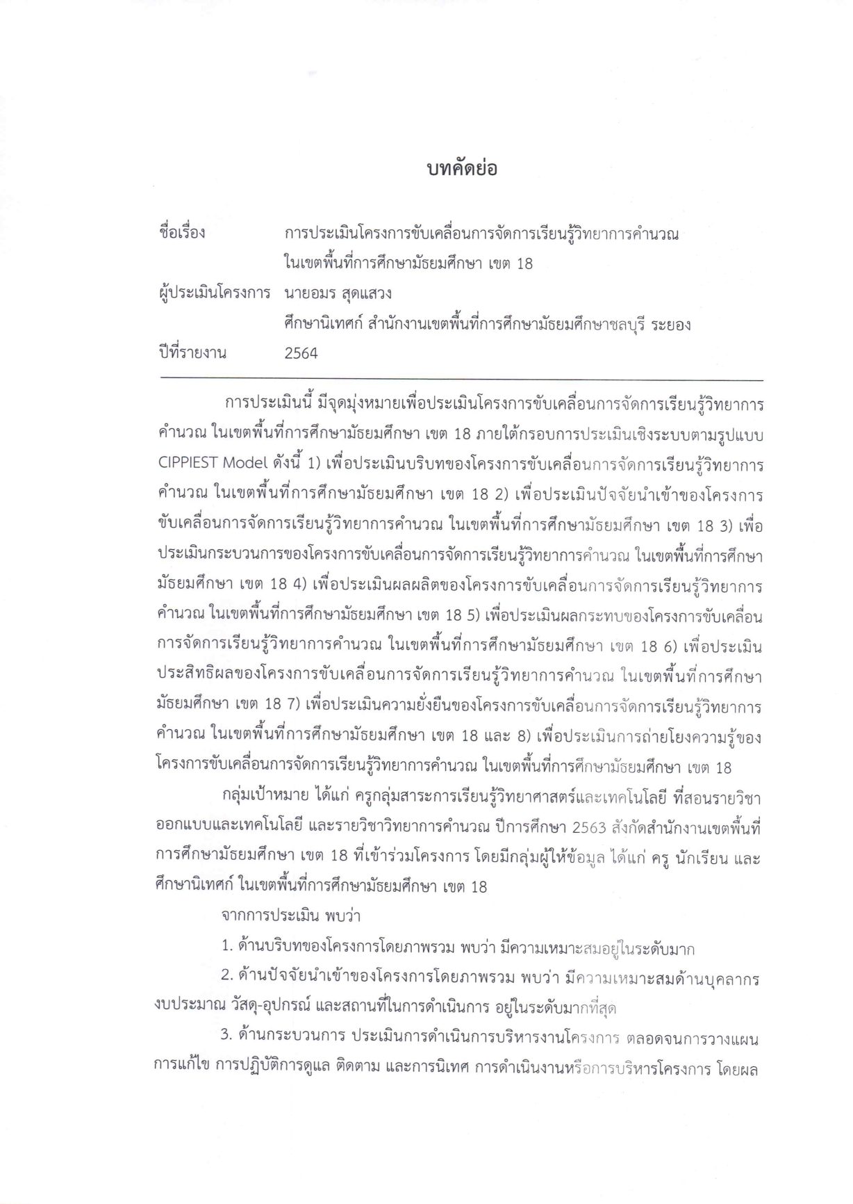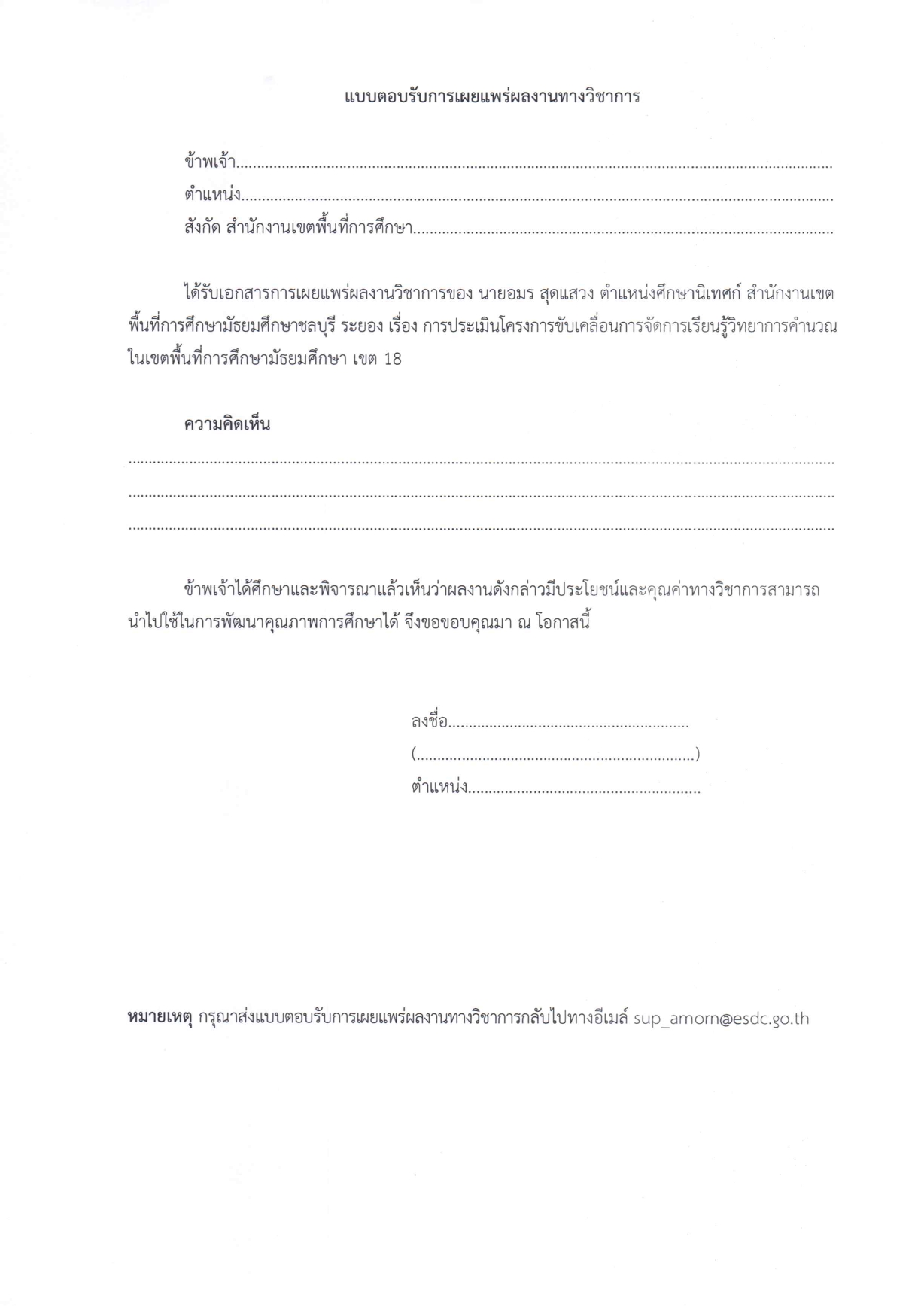 ด้วยสำนักงานเขตพื้นที่การศึกษามัธยมศึกษาชลบุรี ระยอง โดย นายอมร สุดแสวง ตำแหน่งศึกษานิเทศก์ ได้จัดทำผลงานวิชาการ เรื่องการประเมินโครงการขับเคลื่อนการจัดการเรียนรู้วิทยาการคำนวณ ในเขตพื้นที่การศึกษามัธยมศึกษา เขต 18 โดยขอความอนุเคราะห์ส่งแบบตอบรับการเผยแพร่ผลงานทางวิชาการ ดังสิ่งที่ส่งมาด้วย 2 กลับมาทางอีเมล์ sup_amom@esdc.go.th