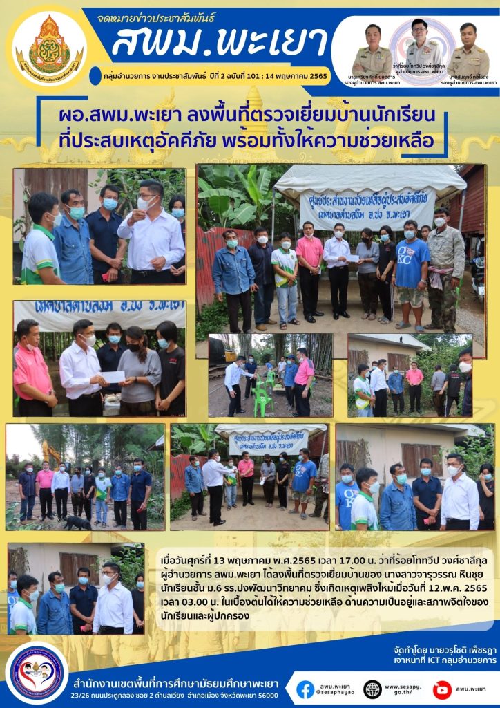 เมื่อวันศุกร์ที่ 13 พฤษภาคม พ.ศ.2565 เวลา 17.00 น. ว่าที่ร้อยโททวีป วงศ์ชาลีกุล ผู้อำนวยการ สพม.พะเยา ได้ลงพื้นที่ตรวจเยี่ยมบ้านของ นางสาวจารุวรรณ หินซุย นักเรียนชั้น ม.6 รร.ปงพัฒนาวิทยาคม ซึ่งเกิดเหตุเพลิงไหม้เมื่อวันที่ 12.พ.ค. 2565 เวลา 03.00 น. ในเบื้องต้นได้ให้ความช่วยเหลือ ด้านความเป็นอยู่และสภาพจิตใจของนักเรียนและผู้ปกครอง