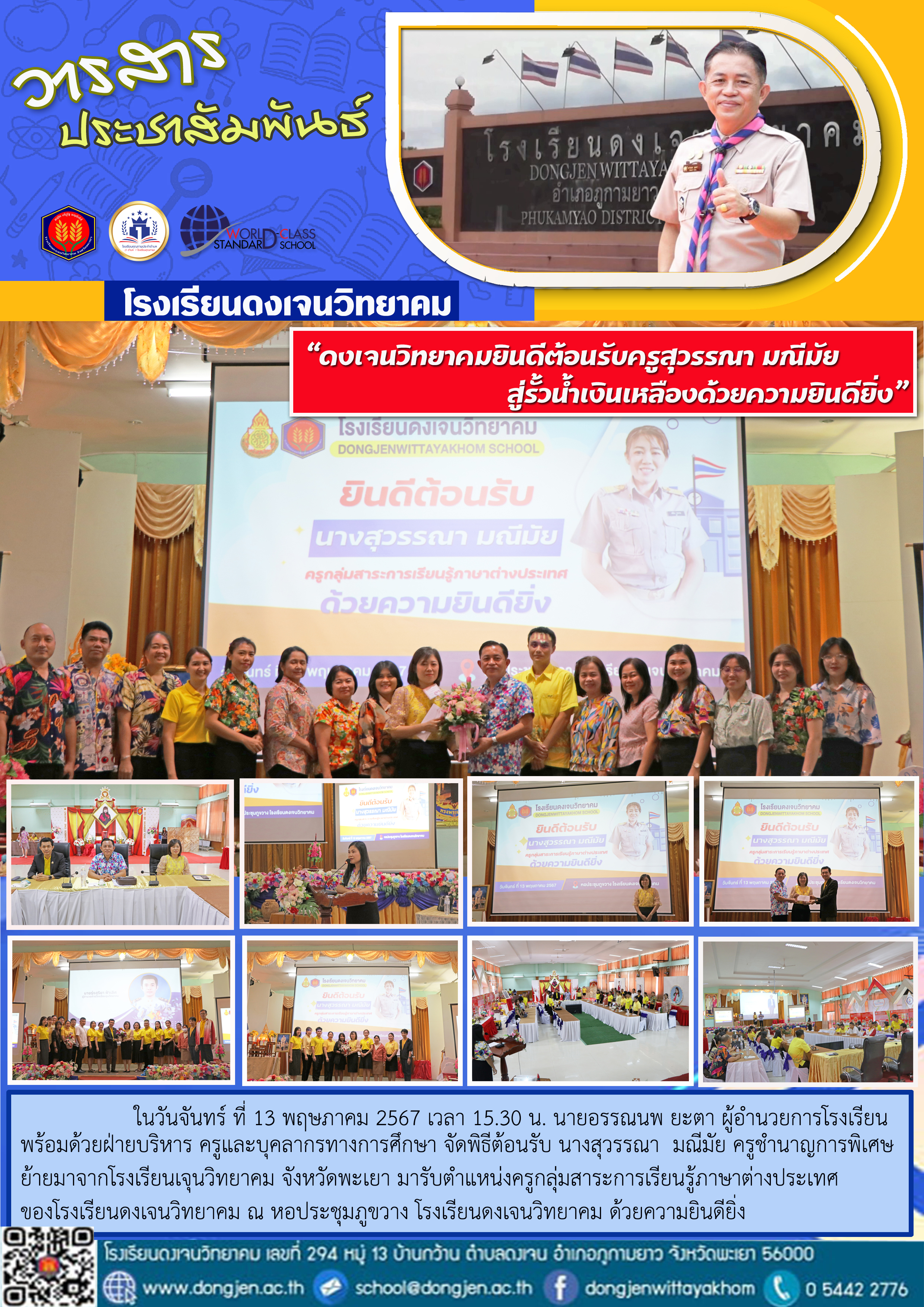 ในวันจันทร์ ที่ 13 พฤษภาคม 2567 เวลา 15.30 น. นายอรรณนพ ยะตา ผู้อำนวยการโรงเรียน พร้อมด้วย นายรัฐกานท์ จางคพิเชียร ผู้อำนวยการโรงเรียน ฝ่ายบริหาร ครูและบุคลากรทางการศึกษา จัดพิธีต้อนรับ นางสุวรรณา มณีมัย ครูชำนาญการพิเศษ ย้ายมาจากโรงเรียนจุนวิทยาคม จังหวัดพะเยา มารับตำแหน่งครู กลุ่มสาระการเรียนรู้ภาษาต่างประเทศ โรงรียนดงเจนวิทยาคม ณ หอประชุมภูขวาง โรงเรียนดงเจนวิทยาคม ด้วยความยินดียิ่ง