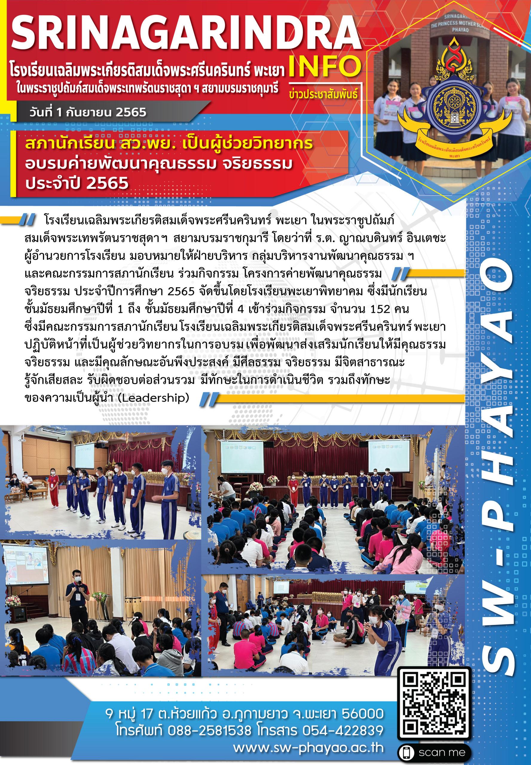 สภานักเรียน สว.พย. เป็นผู้ช่วยวิทยากร อบรมค่ายพัฒนาคุณธรรมจริยธรรม ประจำปี 2565