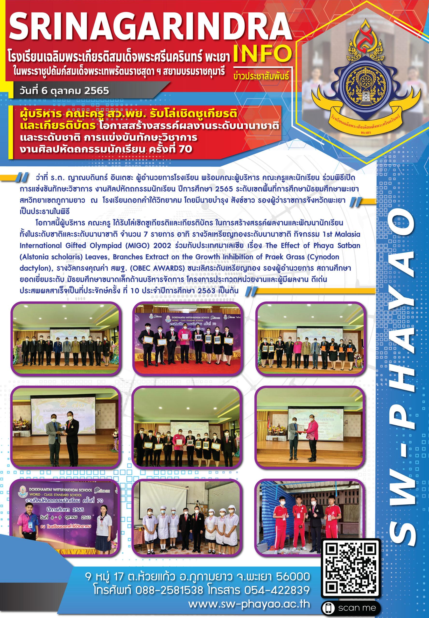 ผู้บริหาร คณะครู สว.พย. รับโล่เชิดชูเกียรติและเกียรติบัตร โอกาสสร้างสรรค์ผลงานระดับนานาชาติ และระดับชาติ การแข่งขันทักษะวิชาการ งานศิลปหัตถกรรมนักเรียน ครั้งที่ 70