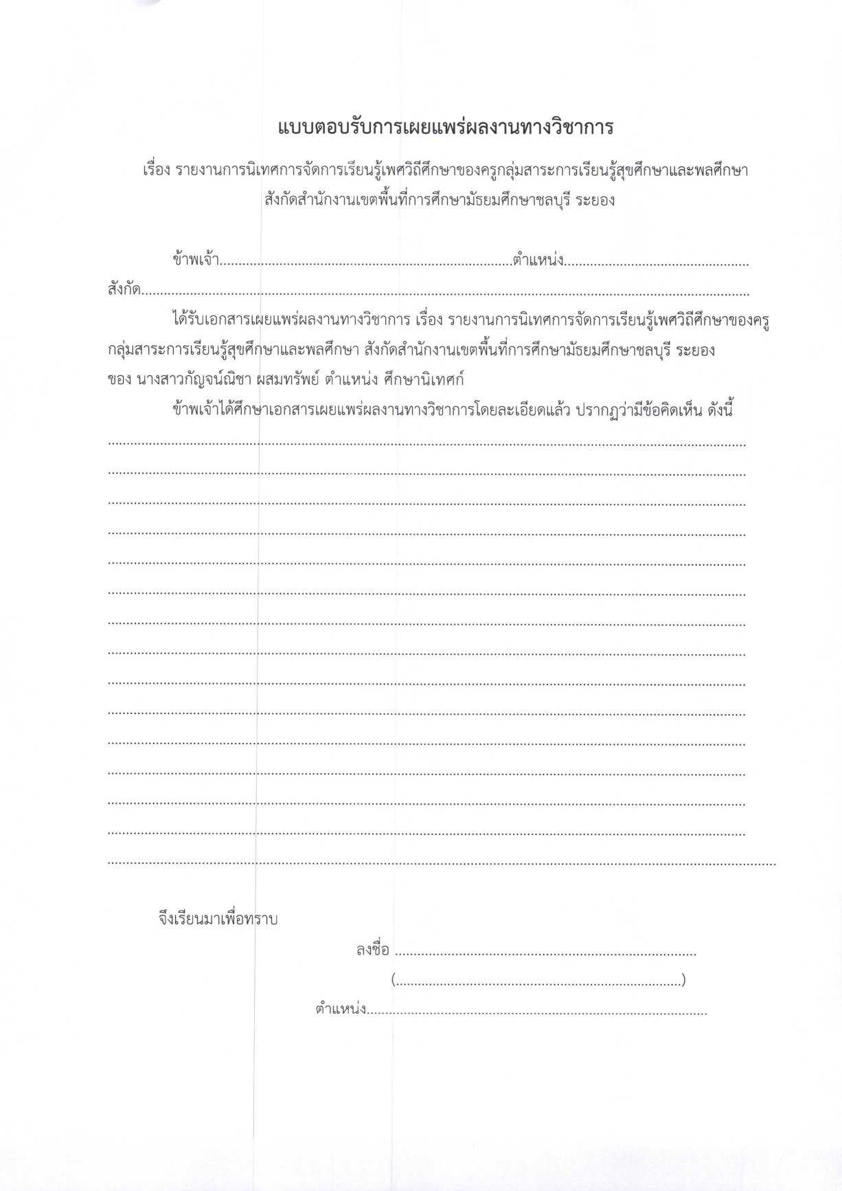 เพื่อรายงานผลการปฏิบัติงานที่ประสบความสำเร็จในการนิเทศการจัดการเรียนรู้เกี่ยวกับเพศวิถีศึกษา และเพื่อเป็นการเผยแพร่แนวทางการดำเนินงานนิเทศภายในสถานศึกษาในการนี้ จึงได้ส่งผลงานทางวิชาการเพื่อการเผยแพร่และขอความอนุเคราะห์ท่านตอบรับดังสิ่งที่ส่งมาด้วย ส่งกลับมายังสำนักงานเขตพื้นที่การศึกษามัธยมศึกษาชลบุรี ระยอง หรือที่ E – mail : Kannicha@spm18.go.th จักเป็นพระคุณยิ่ง และขอชอบคุณทุกท่านมา ณ โอกาสนี้