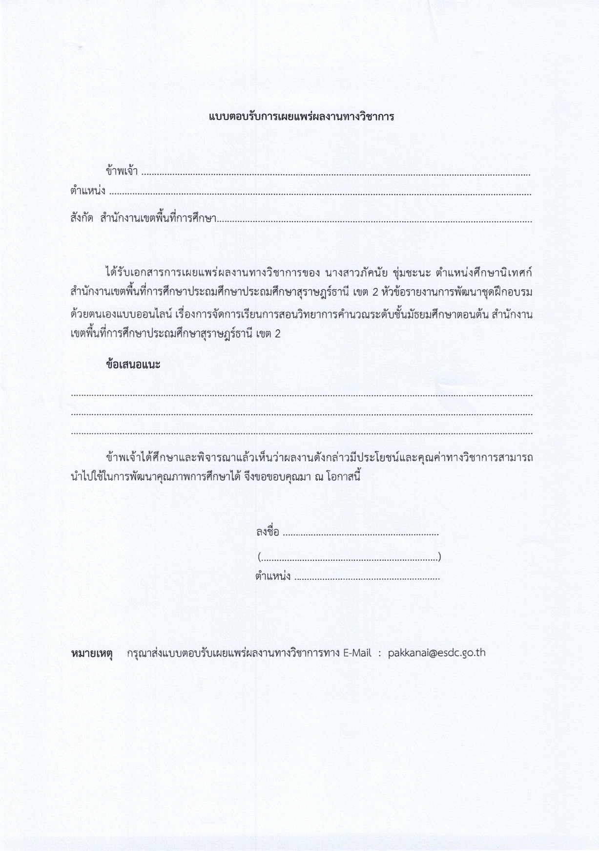 ด้วยสำนักงานเขตพื้นที่ การศึกษาประถมศึกษาสุราษฎร์ธานีเขต 2 โดย นางสาวภัคนัย ชุ่มชะนะ ตำแหน่งศึกษานิเทศก์ ได้จัดทำผลงานทางวิชาการเรื่องการพัฒนาชุดฝึกอบรมด้วยตนเองแบบออนไลน์ เรื่องการจัดการเรียนการสอนวิทยาการคำนวณระดับชั้นมัธยมศึกษาตอนต้น และขอความอนุเคราะห์ส่งแบบตอบรับเผยแพร่ผลงานทางวิชาการ ดังสิ่งที่ส่งมาด้วย 2 ที่แนบมาพร้อมนี้